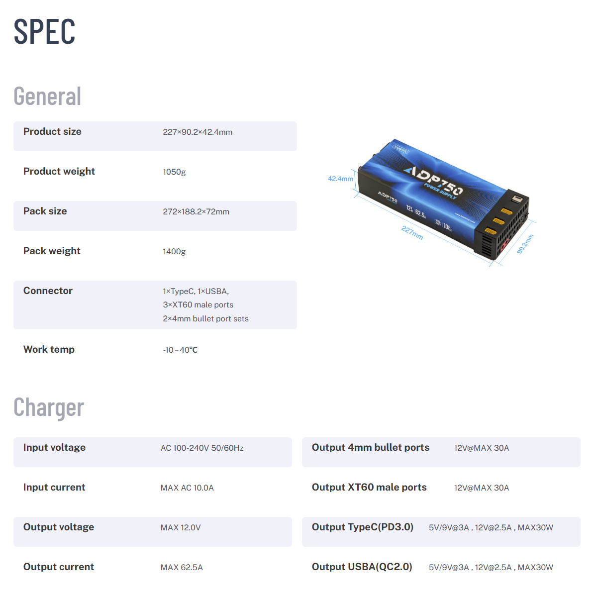 ToolkitRC ADP750 750W安定化電源 DC12V/MAX62.5A+USB電源装備 AC100V対応 |